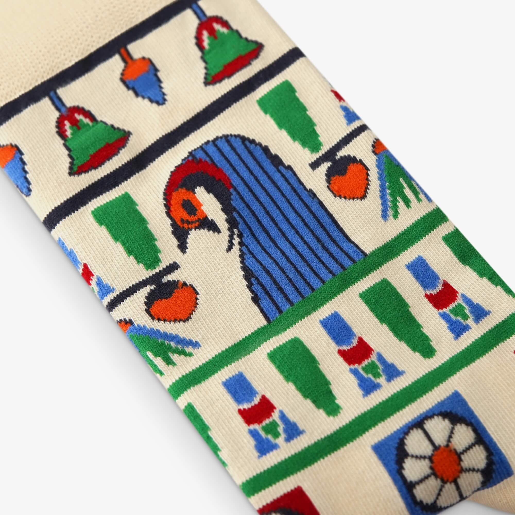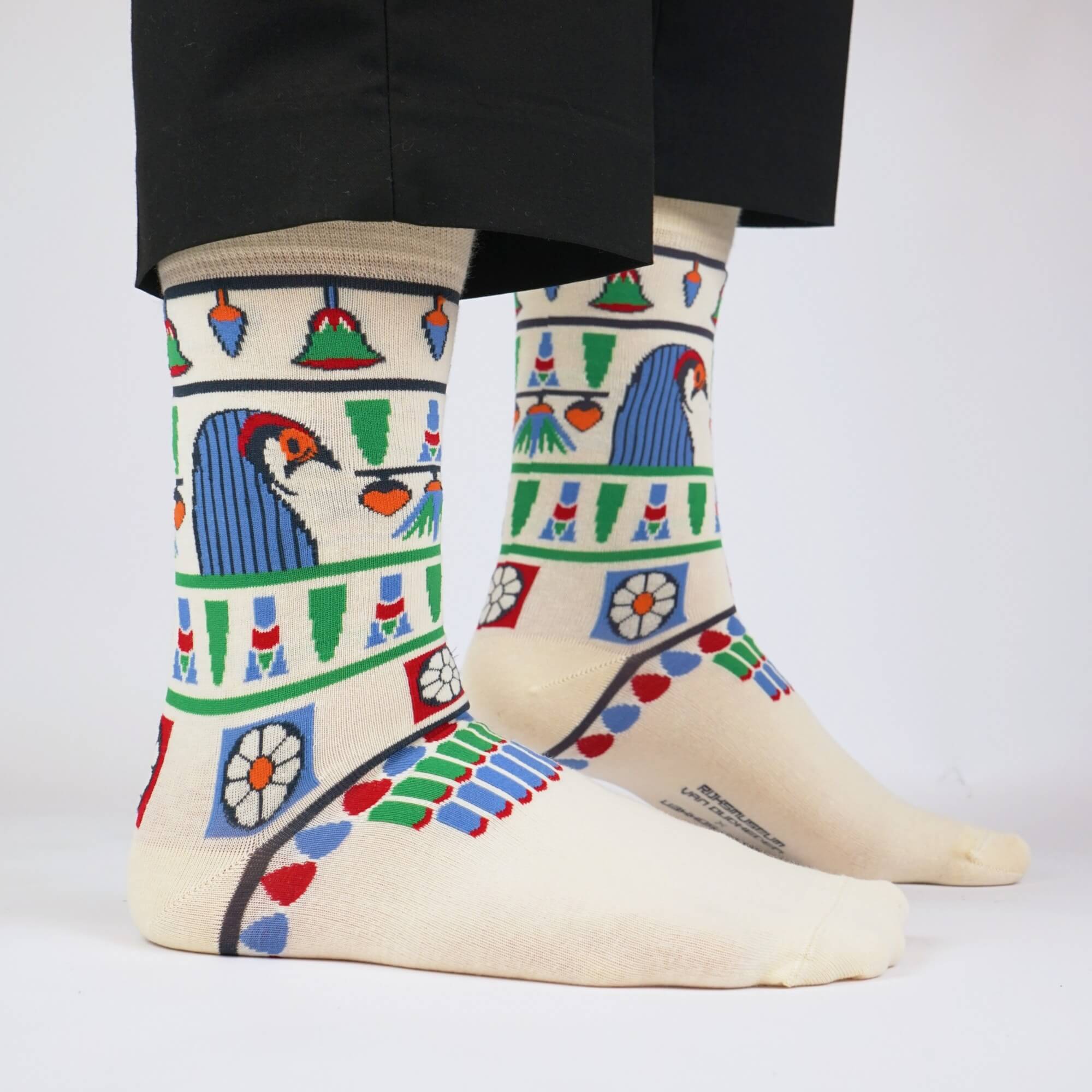 Every layer of the collar is carefully knitted: the geometric patterns, the floral motifs in red, blue, and green, and the central red solar disk. These socks bring the refined art of ancient Egypt into your daily life – a wearable piece of history that shows how the Egyptians believed that beauty and art could transcend death.