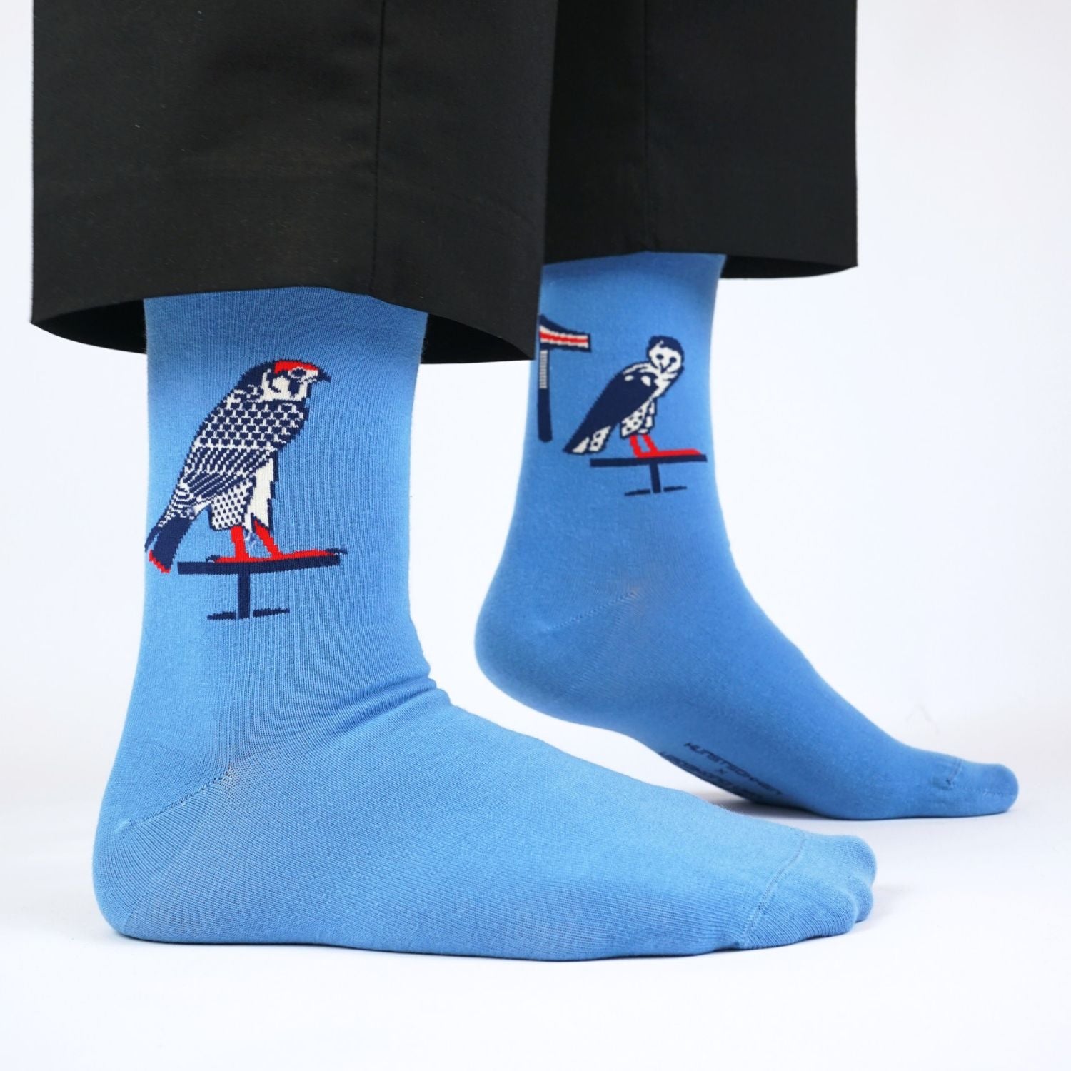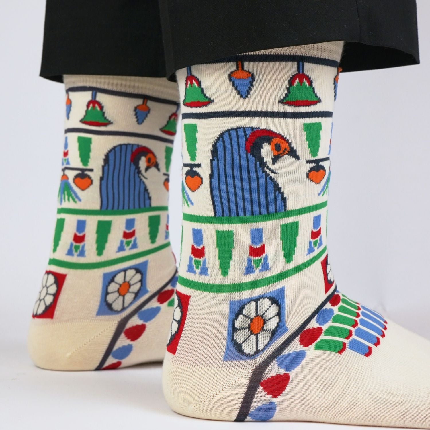 Experience the collaboration between Kunstsokken and the National Museum of Antiquities with this exclusive 2-pack. This set contains two limited edition designs: 'Egyptian Birds' featuring the sacred falcon and owl, and 'Flower Necklace' with the magnificent broad collar of Osiris – both inspired by the 2,600-year-old coffin of Peftjauneith.