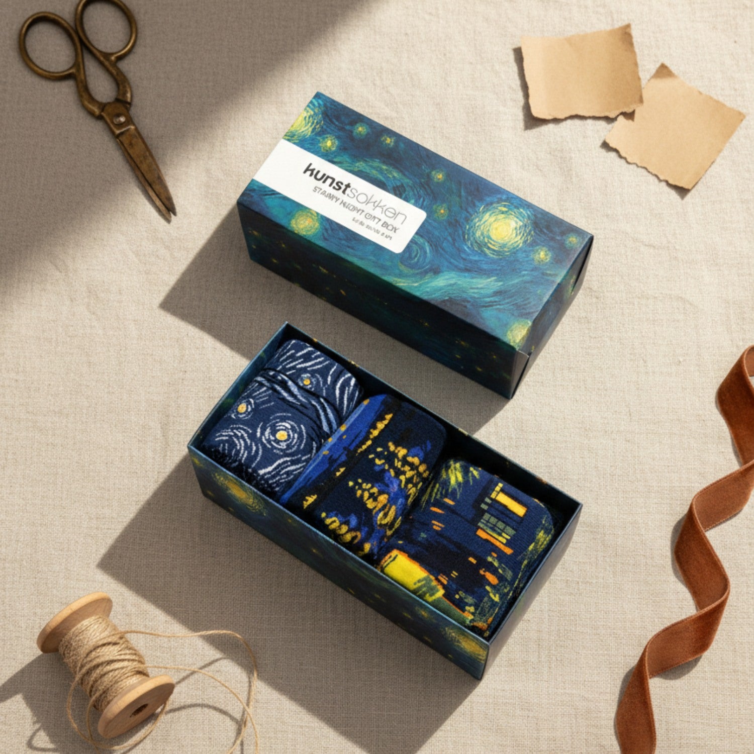 The packaging is designed to honour Van Gogh's art, with refined details that beautifully complement the socks.