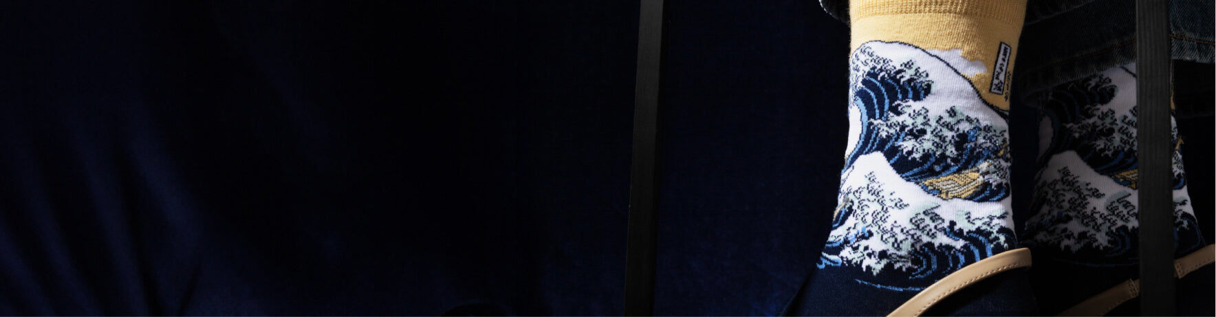 De Grote Golf van Kanagawa sokken geïnspireerd op Hokusai's iconische kunstwerk, gemaakt van biologisch katoen.La Grande Vague de Kanagawa