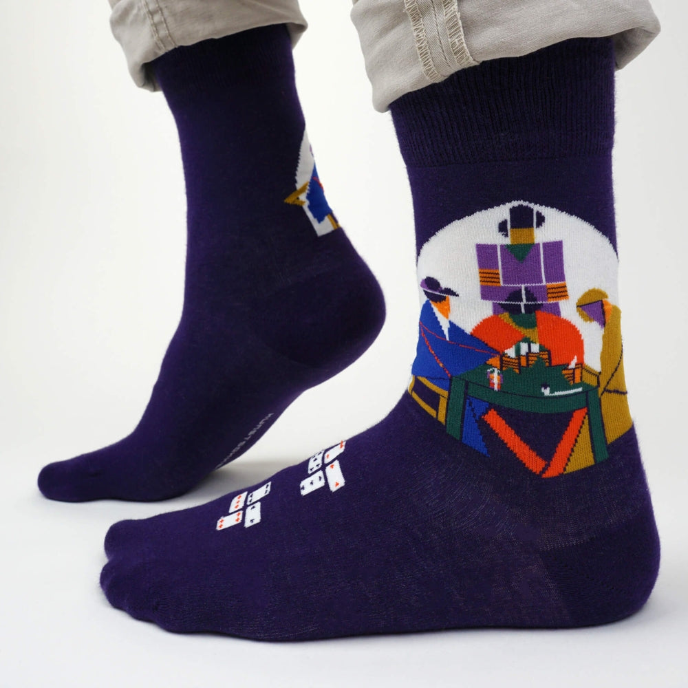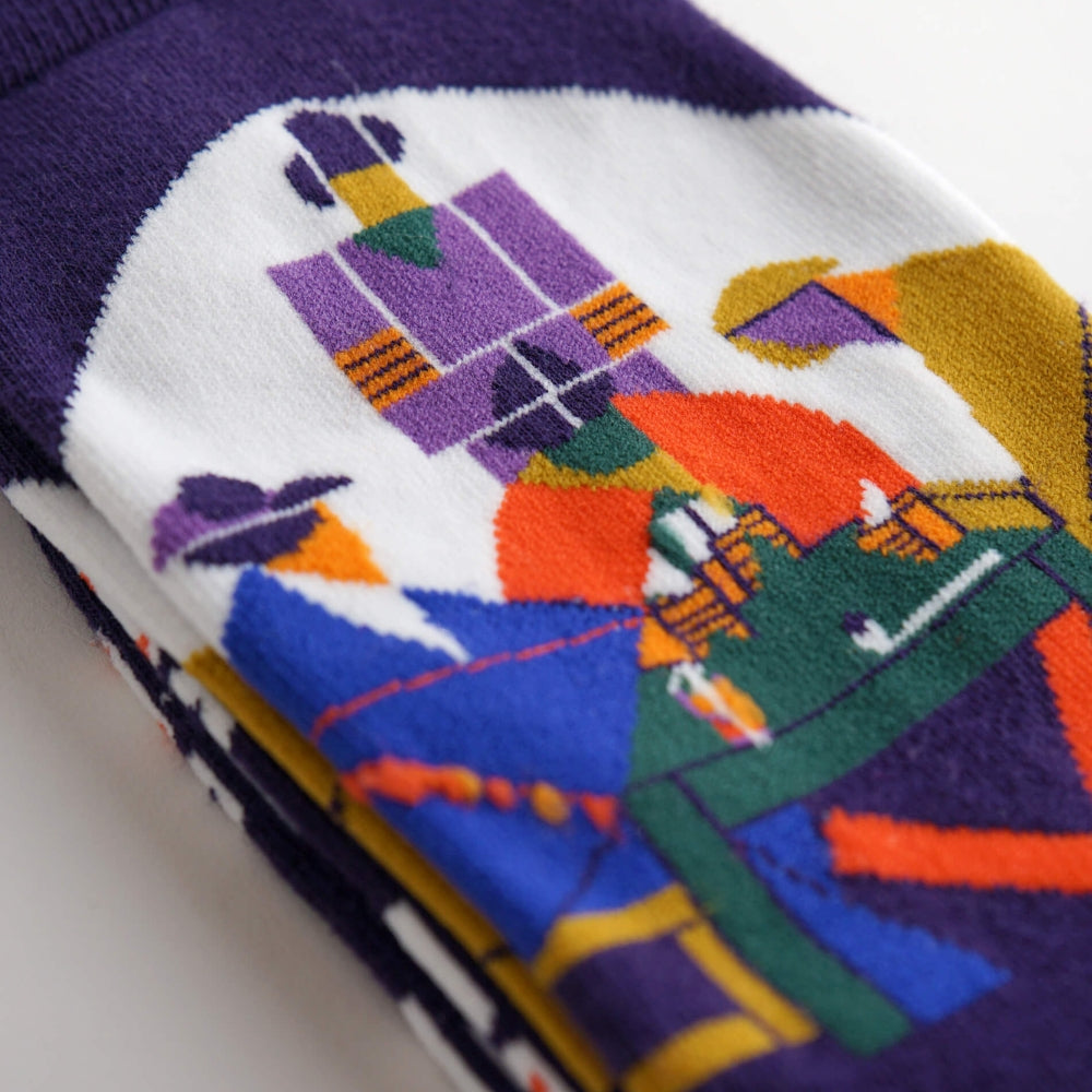 De kunstwerken op onze sokken zijn niet geprint, maar echt ingeweven – iets wat veel mensen verrast. Omdat de kleuren in de stof zijn verweven, blijven ze was na was helder en levendig. Zelfs na tientallen keren dragen zien je sokken er nog steeds stralend uit, alsof ze net uit de verpakking komen. Zo geniet je extra lang van kunst aan je voeten!